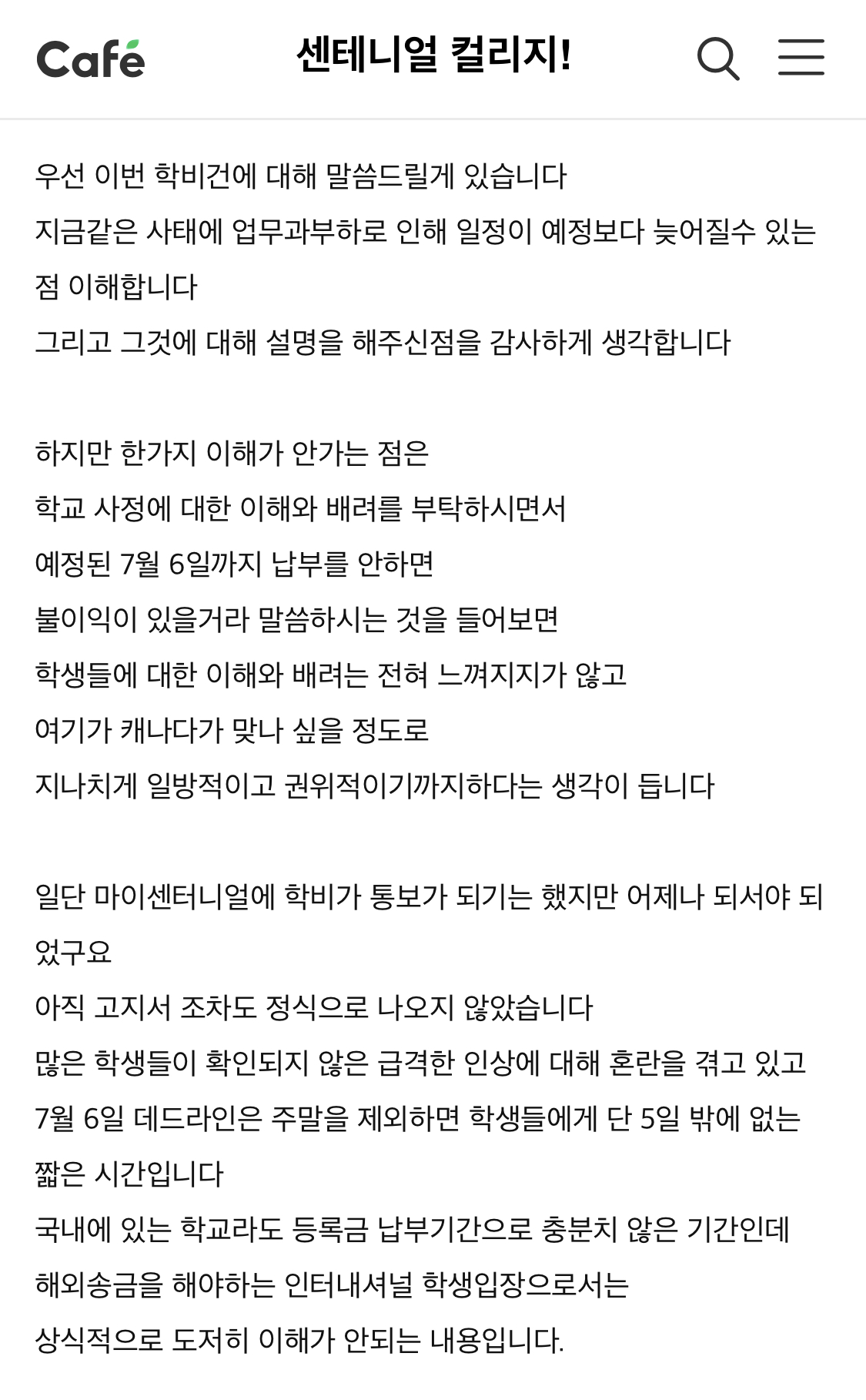 다들 전산 오류일꺼라는 기대를 가지며 네이버 공식 카페에 문의를 하였으나 주말이라 그런지 토론토 현재시간 6월 28일 일요일 오후 8시 현재까지 아무련 답변이 달리지 않고 있다. 아마 내일쯤이면 문의에 대한 답변이 있겠지만 크게 등록금에는 변동이 없을 듯 보인다.